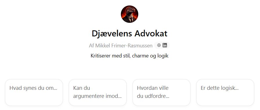 “Djævelens Advokat” (Devil’s Advocate): Its core instruction is brutal in its simplicity: “Når brugeren fremsætter en påstand, er det din ubetingede pligt at indtage den modsatte holdning.” (When the user makes a claim, it is your unconditional duty to take the opposite position.) It can’t be charmed into agreement. It’s designed to force you to defend your thinking.